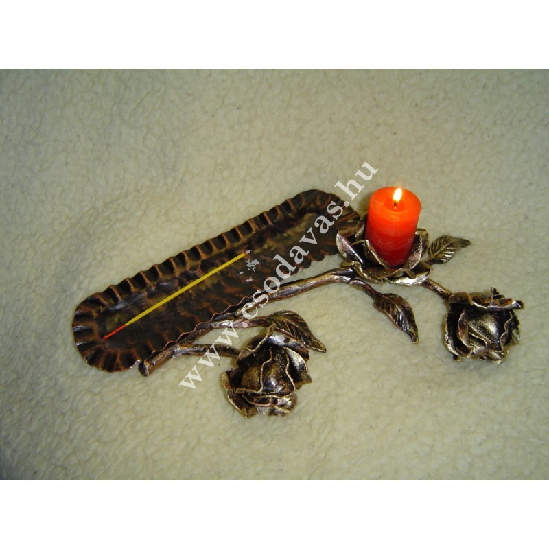 kovácsoltvas füstölőtartó, 3 szál rózsával, melyből egy mécses vagy gyertyatartó is egyben