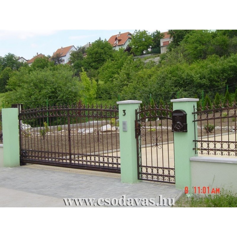Magassága 170cm szélessége 4 méter. Anyaga 12 négyzetacél ,diszítések 12 X6 laposvasból , horganyzott kivitelben ,sín és görgőkkel beszerelve értendő az ára ! Ebben a mintázatban kétszárnyú kapu és tolókapu is rendelhető.
