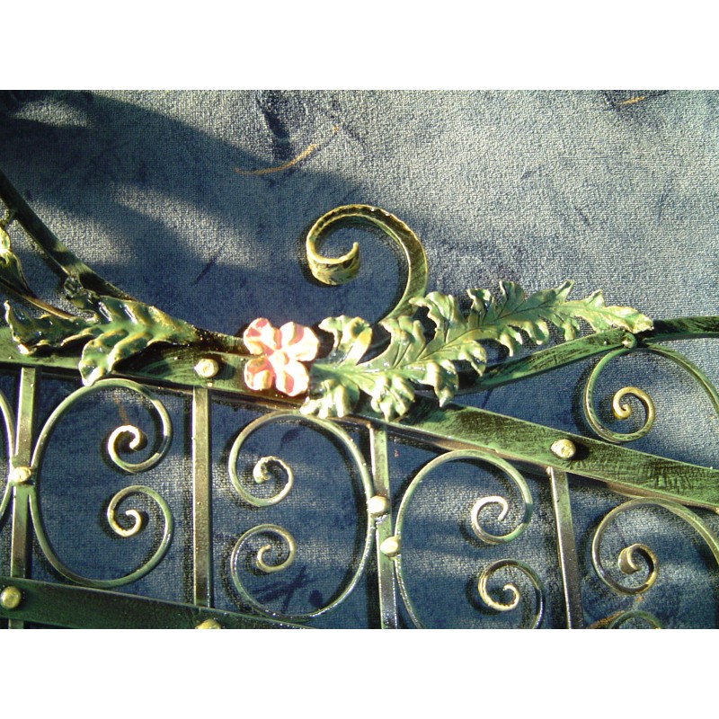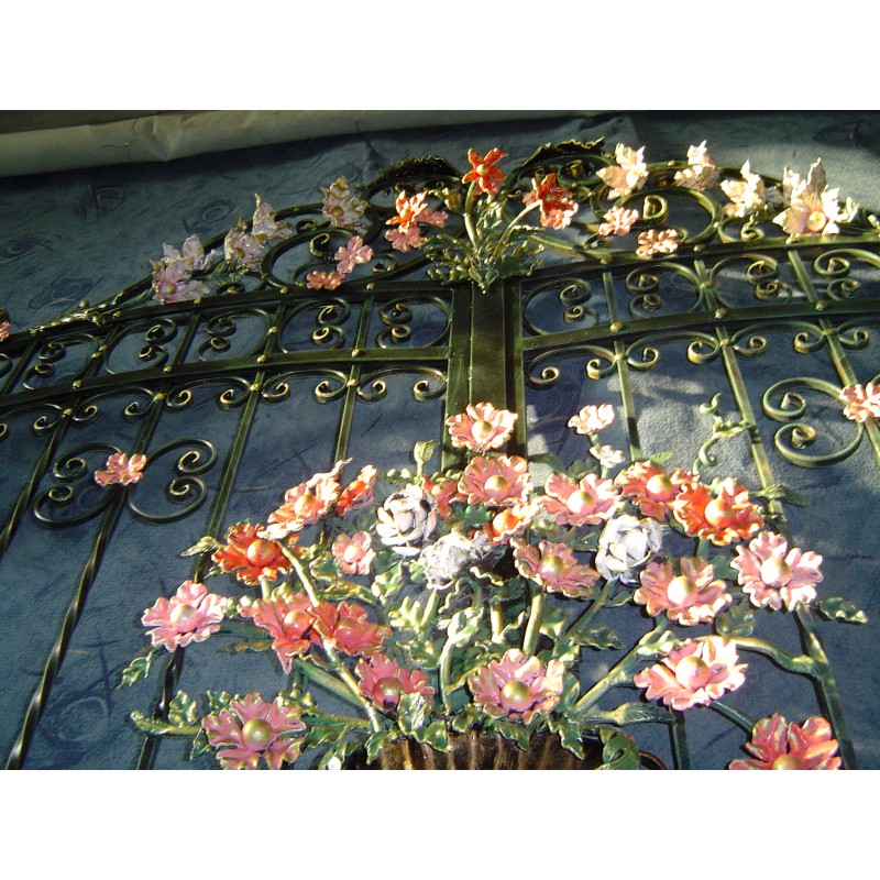 Magasság 1, 90 m ,szélessége 3,6 m ,pálcák 12 négyzetacélból kovácsoltva, levél és virág mintázattal 2,5mm lemezből kovácsolt.