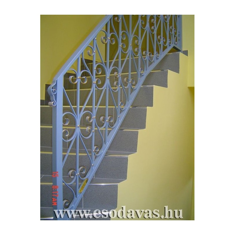Sűrű mintázatú korlát 12-es négyzetacél pálcák ,és 12x5 laposvasból kézi kovácsolt mintázattal. Festése kék szinben és arany antikolt szinben, de más színben és mintázattal is rendlehető.