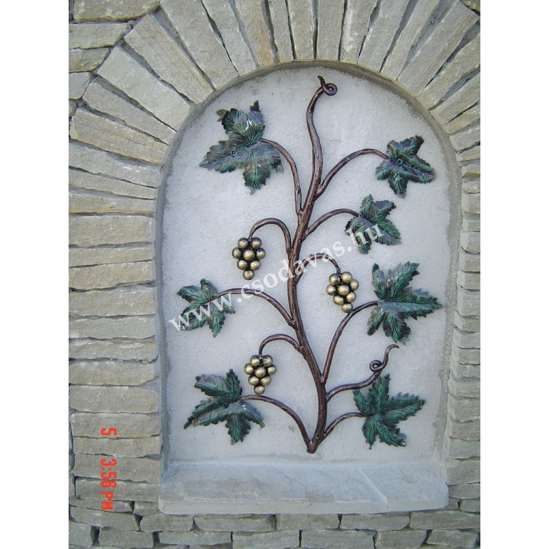 Kovácsoltvas ablak, vakablak, pinceablak, falak, beugrók díszítésére szőlő és levél mintával.