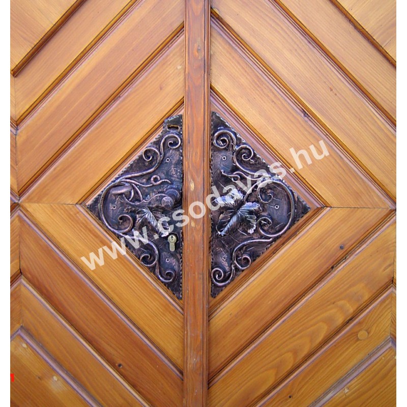 Kézi kovácsolással készült kapu-, ajtóbetét kilinccsel, levél mintázattal.