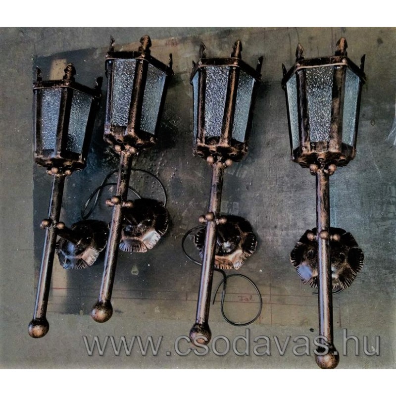 Kézi kovácsolással készült fali fáklyalámpa, 6 oldalas üvegezett.