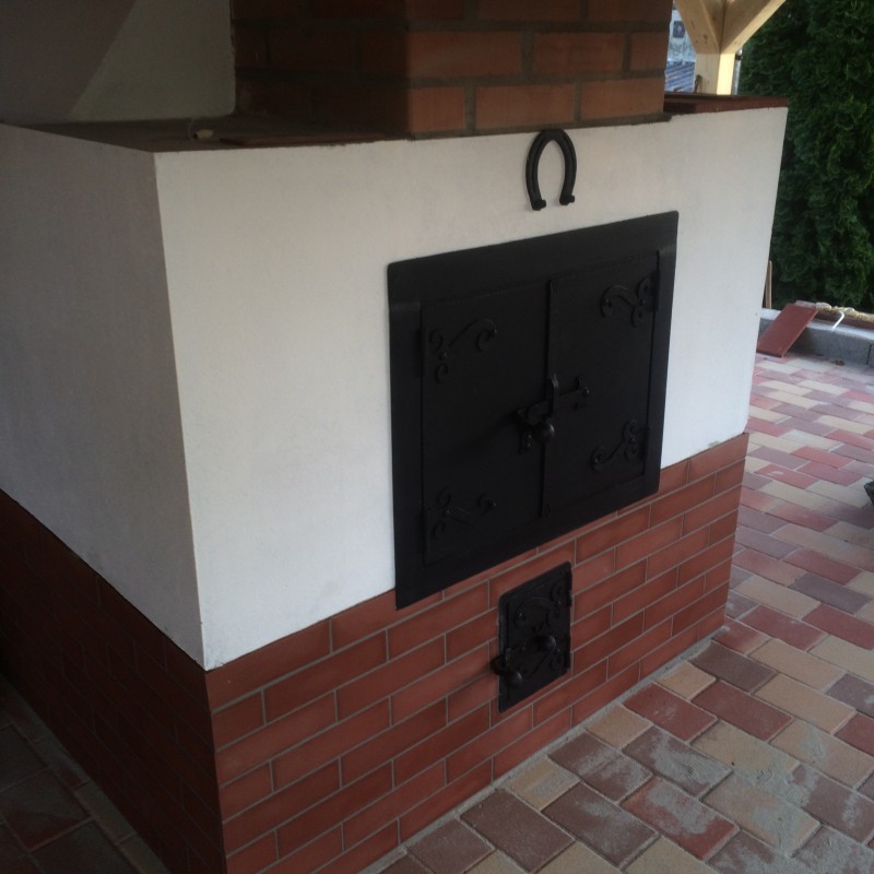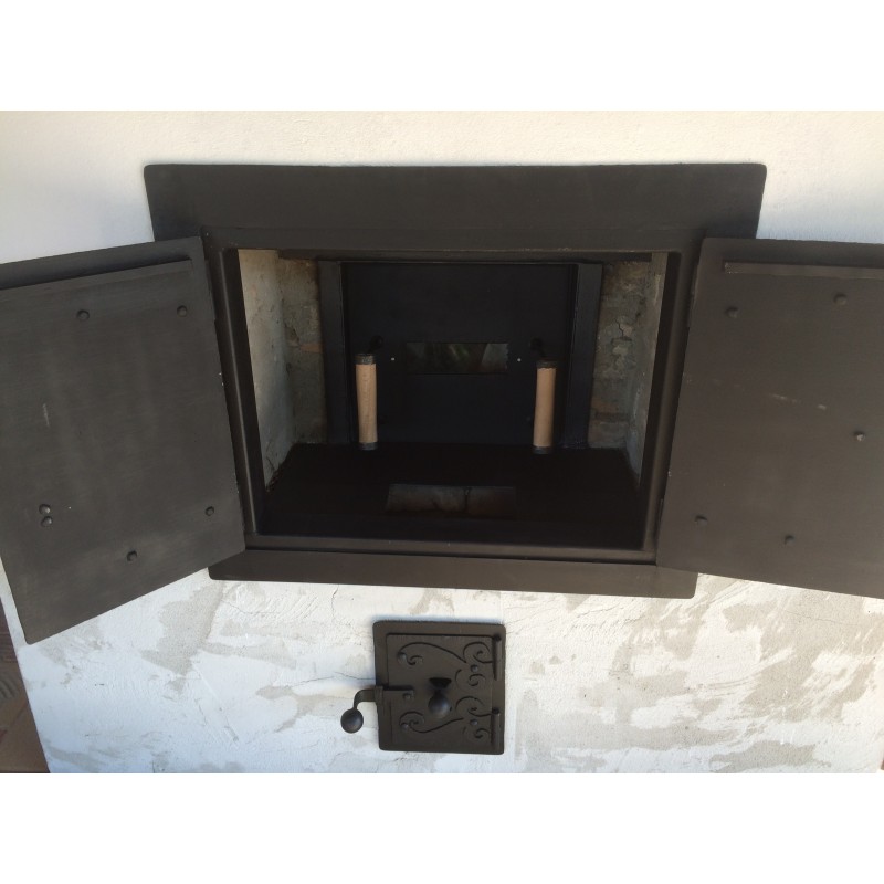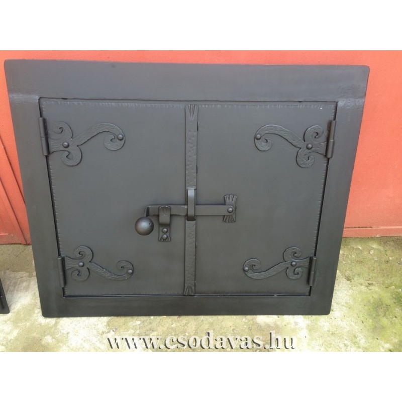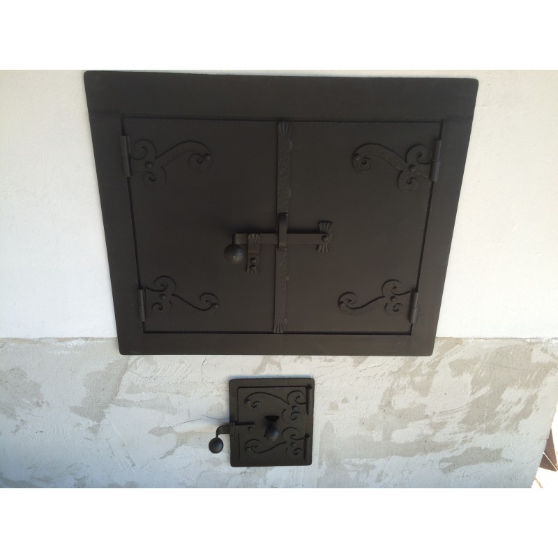 Kétszárnyú erős 4 mm lemezből készült ,díszes ajtópántokkal ,fekete vagy antikolt szinekben rendelhető ,mérete 55cm x 55cm .