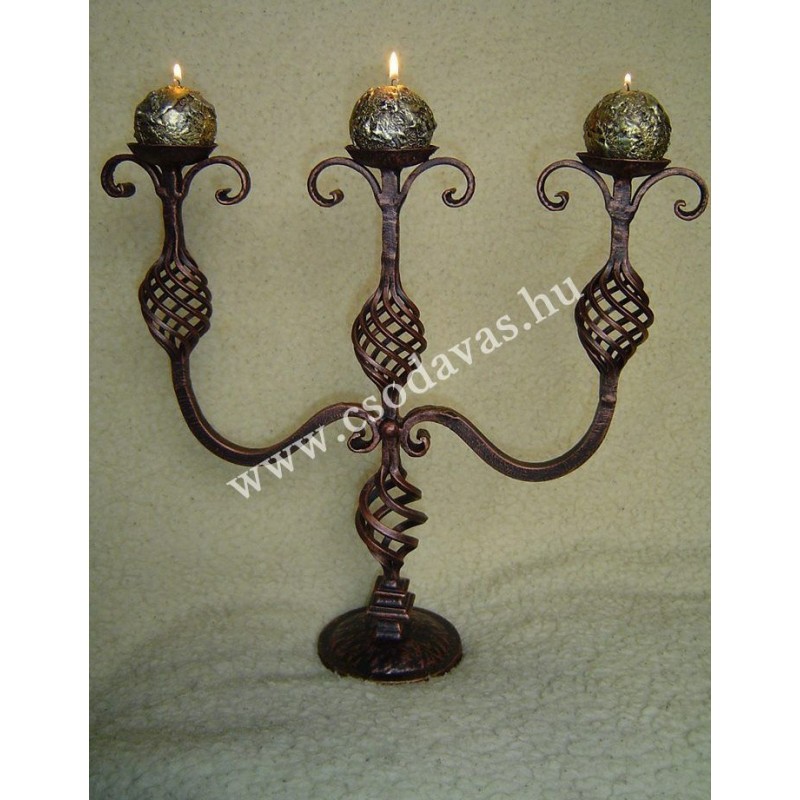 Kovácsolt asztali gyertyatartó. Háromágú látványos 42 cm magasságú, kisebb méretben is rendelhető .