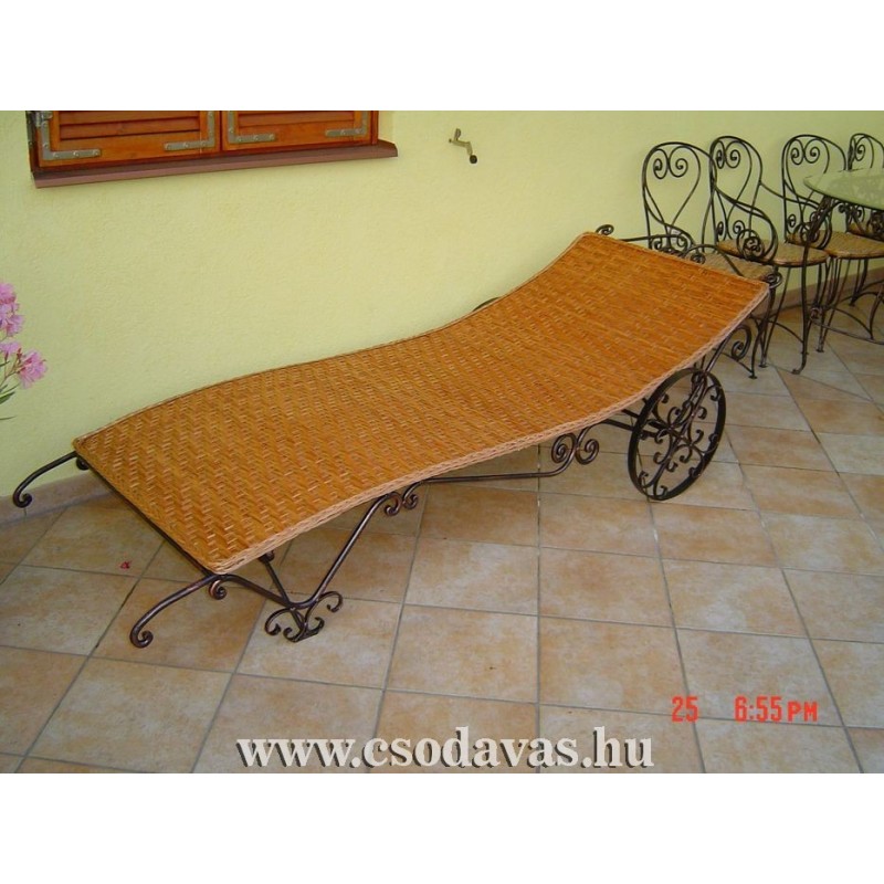 Kovácsoltvas napozóágy . Fónott felülettel egyedi , időjárásálló napozóágy kovácsoltvas váz és kerekekken mozgatható stapil 16gömbvas acél váz. Ára : 110000