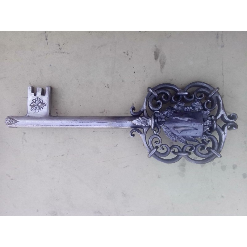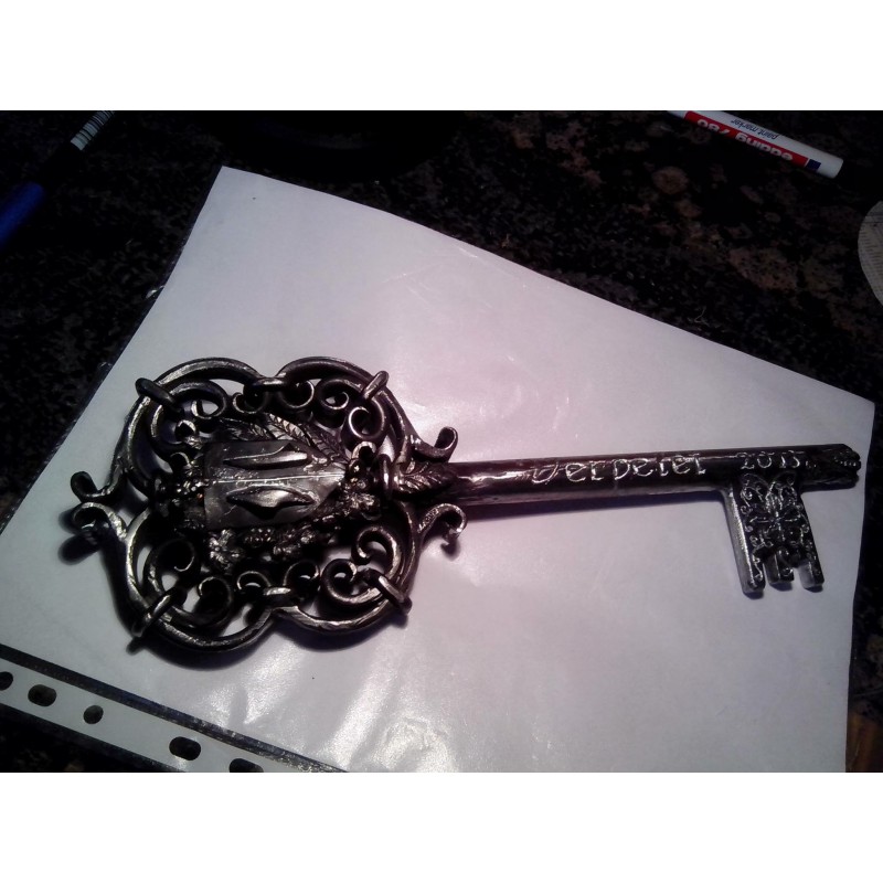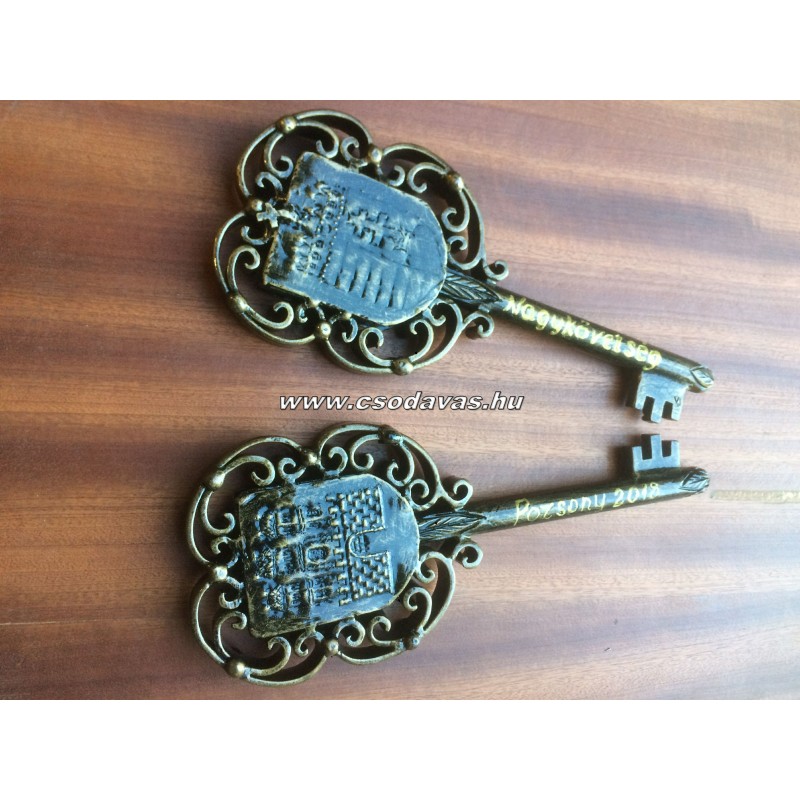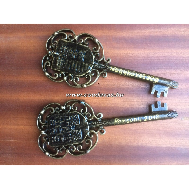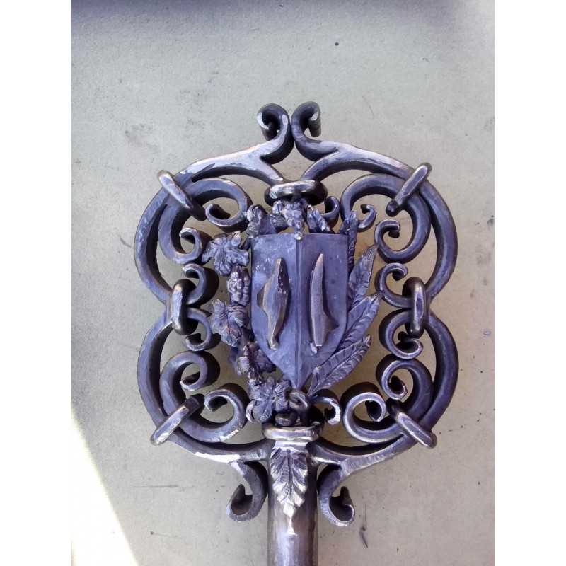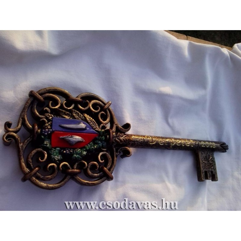 Kovácsolt Diszkulcs . Aprolékos kidoldozú disz kulcs a képen látható Verpelét városnak készült , finom kidolgózással cimerrel gravirozva és festve . A képen látható kulcs ára 47000 Ft.