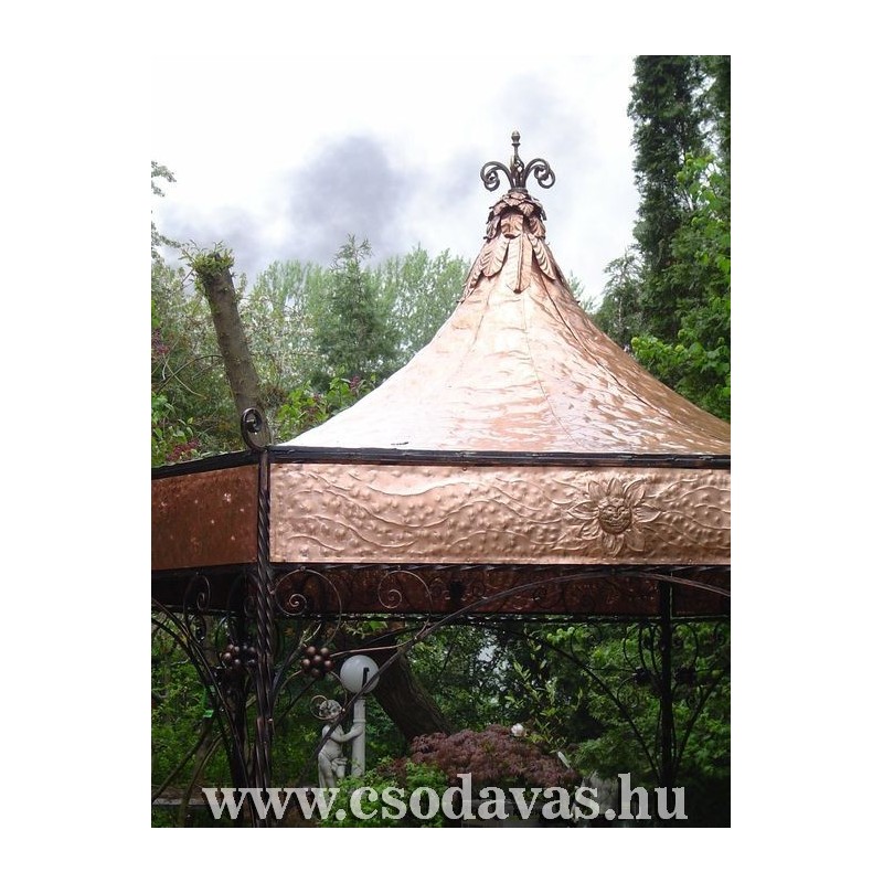 Vörösréz tetők pergolák készitése ,egyedi domboritott mintázattal ,sárgaréz burkolattal is rendelhetőek , a képen látható kerti pergola csucsos tetőszerkezete 4,5m hatszögletü tetőszerkezet és kovácsolt váz összesen 780000Ft.
